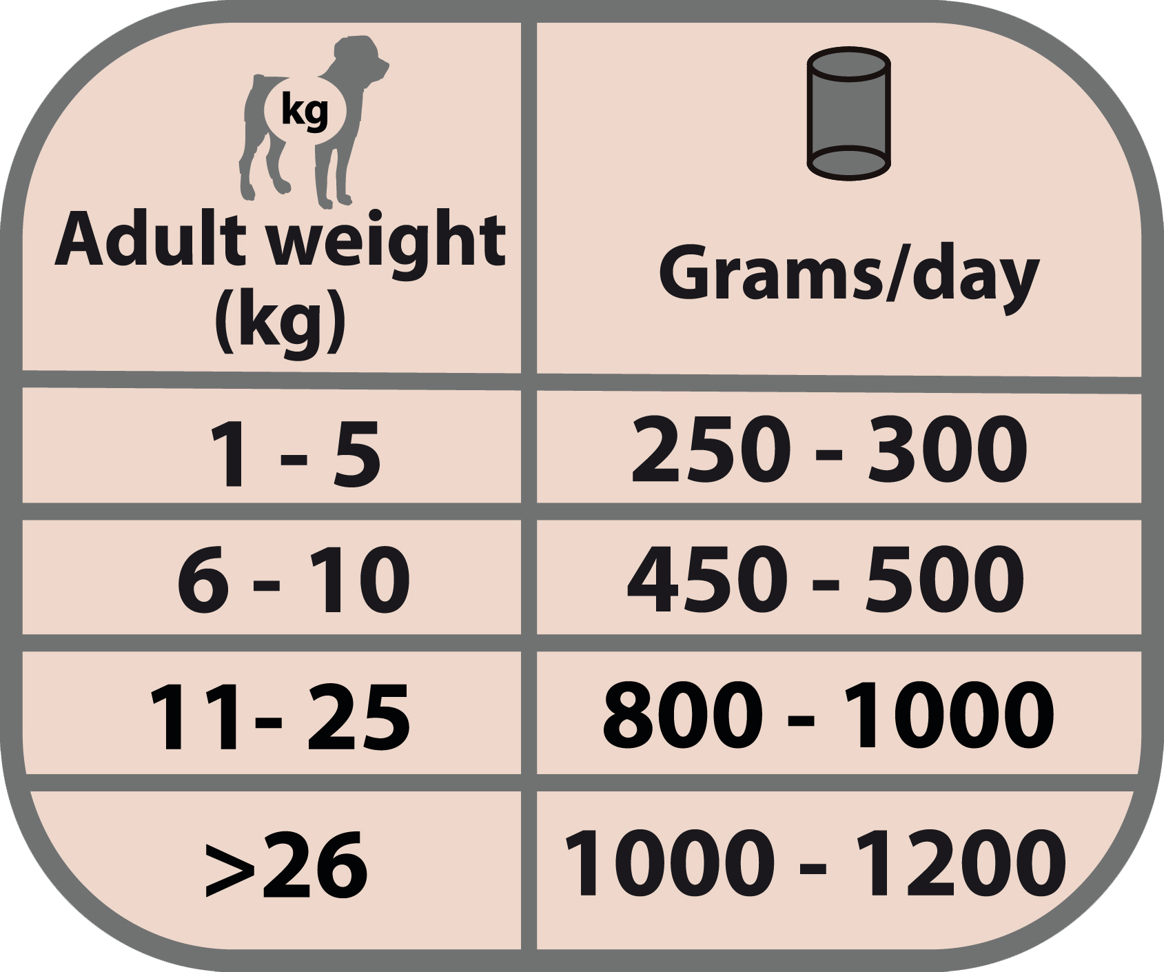 Vær oppmerksom på at denne doseringstabellen er veiledende, og at mengden fôr kan variere avhengig av aktivitet, hunderase og miljøforhold. Husk at du må oppbevare boksen med fôret i kjøleskapet etter åpning og konsumere det innen 48 timer. Sørg for at hunden din alltid har en skål med friskt vann tilgjengelig.