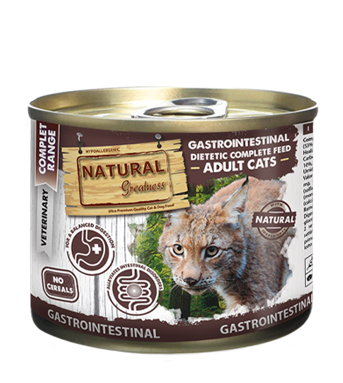 Natural Greatness GASTROINTESTINAL 200g er et våtfôr laget for juniorkatter og voksne katter med akutt eller kronisk diaré, inflammatorisk tarmsykdom (IBD), gastroenteritt, tilfeller av dårlig fordøyelse, kolitt eller anoreksi.