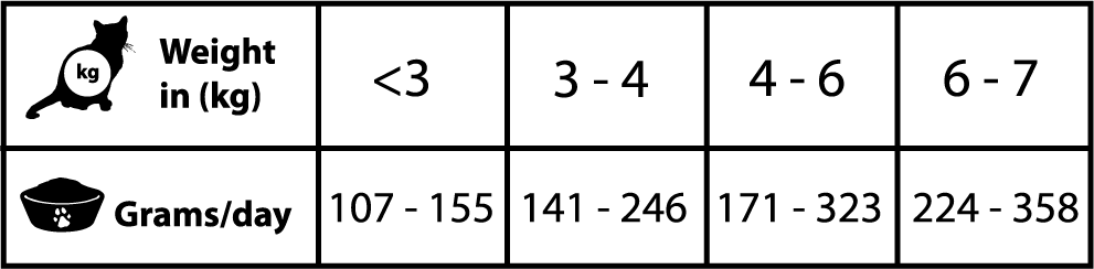 Vær oppmerksom på at denne doseringstabellen er veiledende, og at mengden fôr kan variere avhengig av aktivitet, kattrase og miljøforhold.