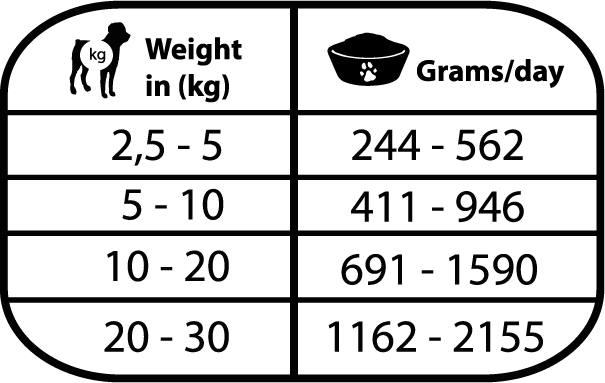 Vær oppmerksom på at doseringstabellen ( på bildet eller produktets emballasje) er veiledende, og at mengden fôr kan variere avhengig av aktivitet, hunderase og miljøforhold.
