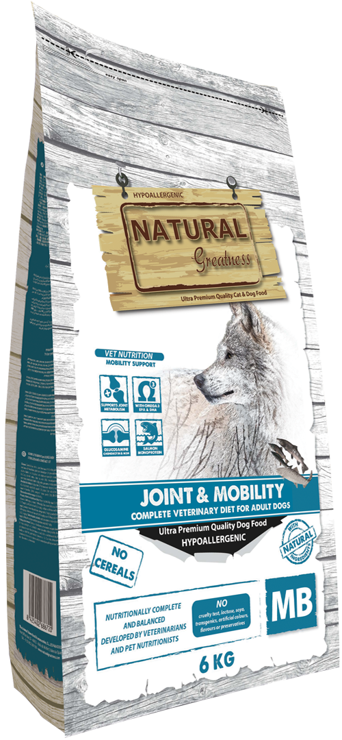 Natural Greatness JOINT & MOBILITY er Natural Greatness sin veterinærdiett for voksne hunder med leddproblematikk. Smakfullt, komplett og kornfritt hundefôr med laks som eneste animalske proteinkilde.