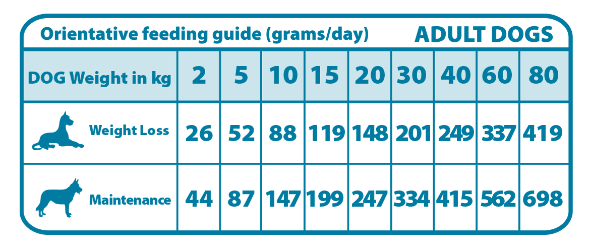 Mengden fôr kan variere avhengig av aktivitet, hunderase og miljøforhold. Se tabell på bilde eller bakside av posen for anbefalt daglig rasjon.