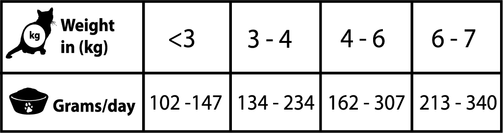 Vær oppmerksom på at denne doseringstabellen er veiledende, og at mengden fôr kan variere avhengig av aktivitet, kattrase og miljøforhold.