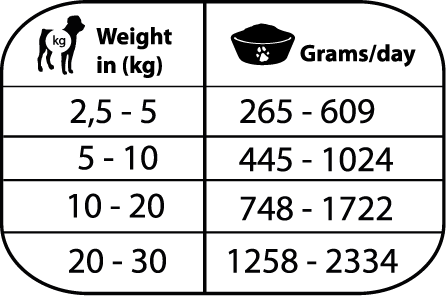 Vær oppmerksom på at doseringstabellen ( på bildet eller produktets emballasje) er veiledende, og at mengden fôr kan variere avhengig av aktivitet, hunderase og miljøforhold.