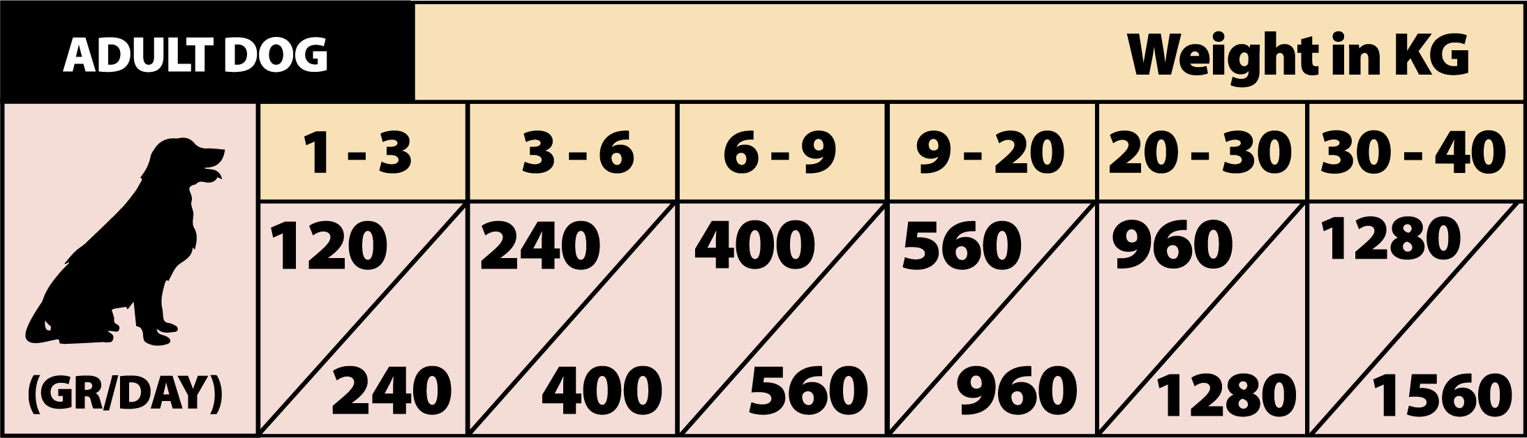 Vær oppmerksom på at doseringstabellen ( på eget bildet eller på produktets emballasje) er veiledende, og at mengden fôr kan variere avhengig av aktivitet, hunderase og miljøforhold.
