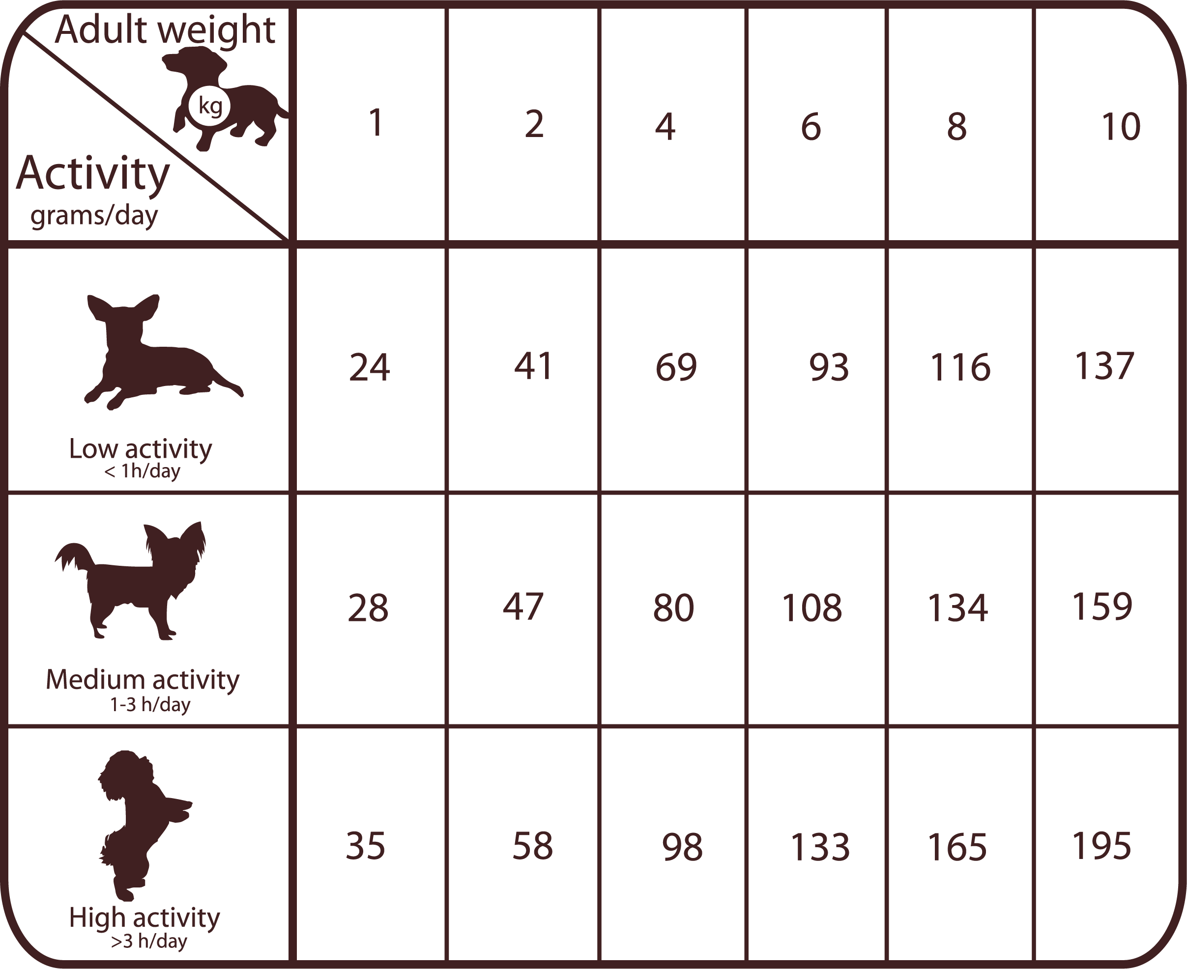 Mengden fôr kan variere avhengig av aktivitet, hunderase og miljøforhold. Se tabell på bilde eller bakside av posen for anbefalt daglig rasjon.