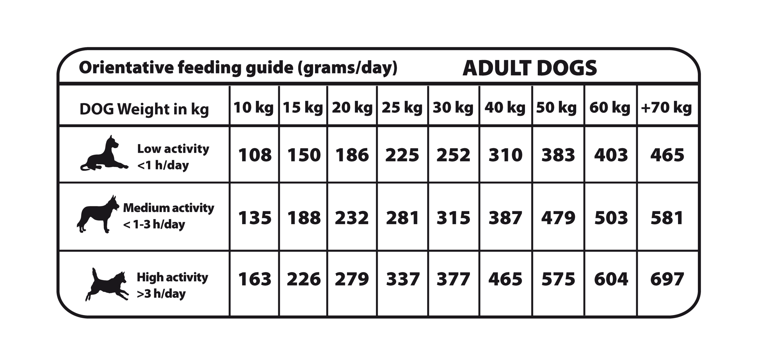 Mengden fôr kan variere avhengig av aktivitet, hunderase og miljøforhold. Se tabell på bilde eller bakside av posen for anbefalt daglig rasjon.