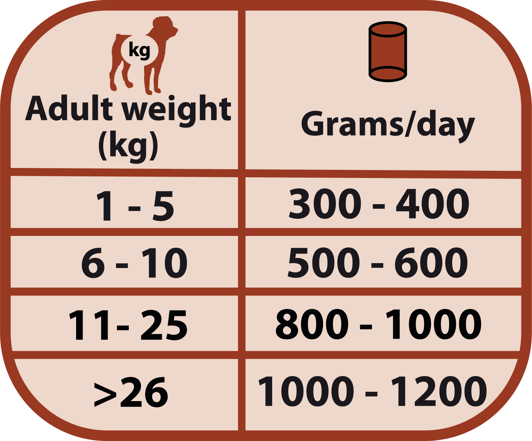 Vær oppmerksom på at denne doseringstabellen er veiledende, og at mengden fôr kan variere avhengig av aktivitet, hunderase og miljøforhold. Husk at du må oppbevare boksen med fôret i kjøleskapet etter åpning og konsumere det innen 48 timer. Sørg for at hunden din alltid har en skål med friskt vann tilgjengelig.