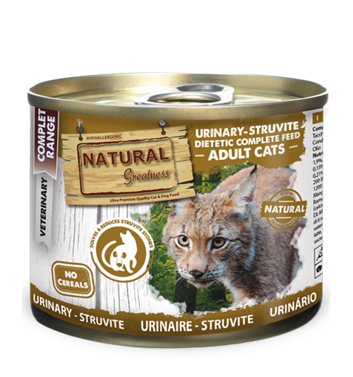 Natural Greatness URINARY-STRUVITE 200g er et hypoallergenisk, kornfritt våtfôr formulert for junior- og voksne katter med felin idiopatisk blærekatarr og struvitt-urolithiasis.