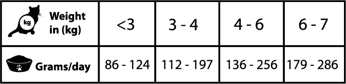 Vær oppmerksom på at denne doseringstabellen er veiledende, og at mengden fôr kan variere avhengig av aktivitet, kattrase og miljøforhold.